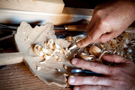 carvers Hands work with chisel in workshop