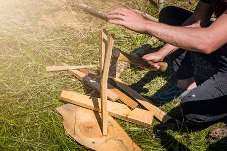 Preparation of chips for a fire. Hands pound a flat wooden board with a large ax