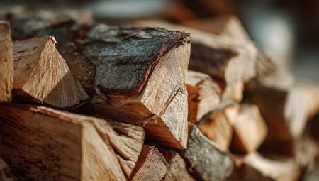 This image showcases a pile of freshly split firewood, ready for use. The wood exhibits various shades of brown and natural textures, with visible grain and rough edges. The composition utilizes a shallow depth of field, focusing on the foreground. The warm lighting suggests an outdoor or natural environment, ideal for commercial or illustrative purposes.