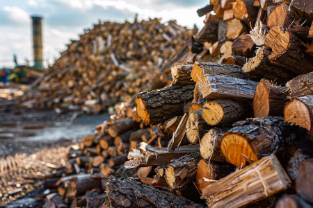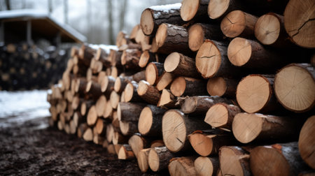 AI Generated. Stacked logs ready for processing at a timber mill in the early morning light