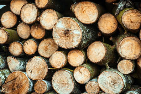 Pile of wood logs background. Round wooden texture. Freshly cut tree wooden logs for winter