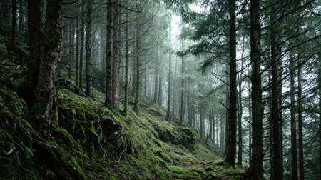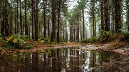 Explore a peaceful misty forest scene with tall trees, lush greenery, and soft morning light. This serene landscape invites tranquility and connection with nature.