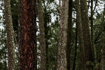 Beautiful landscape of pine forest in summer day. Nature Wallpaper. The tall trees of the pine trees growing in the old forest