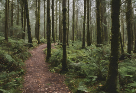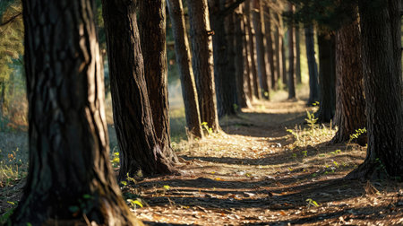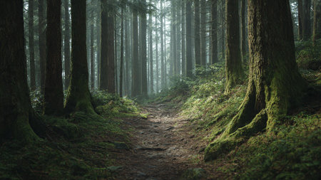 A captivating view of a serene forest pathway, showcasing tall trees with vibrant moss at the base, filtered sunlight creating a tranquil atmosphere in nature.