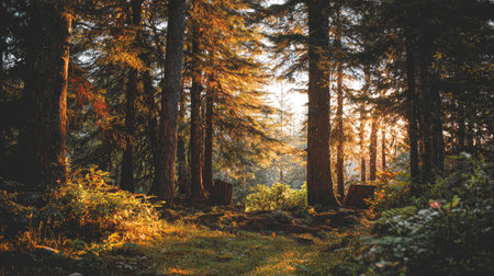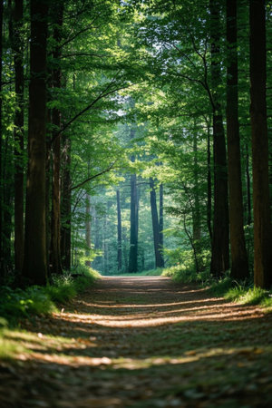 Discover a tranquil forest landscape where soft sunlight illuminates a peaceful pathway among tall trees and vibrant greenery, inviting exploration and relaxation.