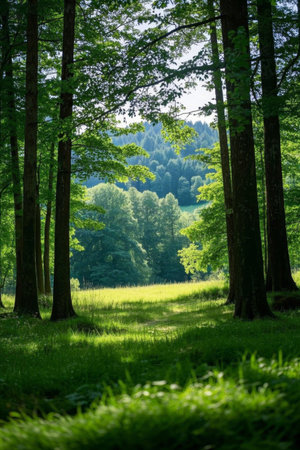 A serene forest scene showcasing tall trees with vibrant greenery and soft sunlight filtering through the canopy, creating a tranquil atmosphere perfect for nature lovers.