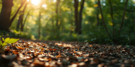 Serene Forest Pathway Illuminated by Golden Sunlight During Early Evening