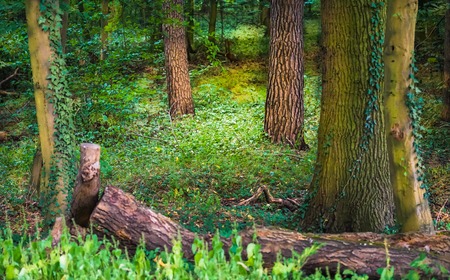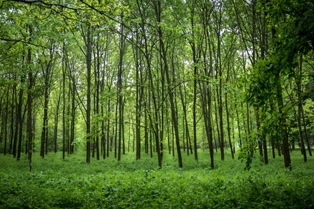 A forest scene showcases tall trees and a pathway winding through lush vegetation. The image displays a natural environment with vibrant green foliage and sunlight filtering through the canopy. This photograph could be used for various purposes, including editorial content, nature documentaries, or environmental illustrations.