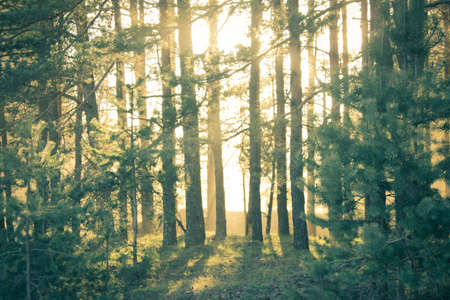 Pine forest at sunset. A ray of sunshine peeks through the trees. Skazany forest lit by the rays coming from the sun.