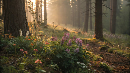 Patches of warm light spill into the underbrush revealing s of wildflowers nestled ast rich earthy tones..