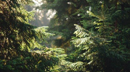 This captivating image captures a tranquil forest scene with tall trees and lush greenery, where gentle sunlight filters through thick foliage, creating a peaceful atmosphere.