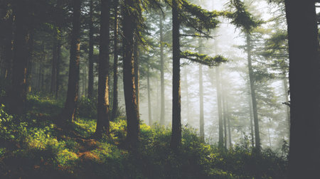 An atmospheric landscape features tall evergreen trees shrouded in thick fog. The scene is dominated by shades of green and gray, with soft lighting and a blurred background. Suitable for a variety of uses including environmental, travel, and natural beauty themes.