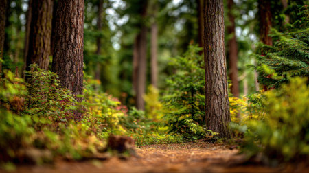 Discover a serene path winding through a majestic pine forest, surrounded by tall trees and lush greenery, inviting exploration in a peaceful natural setting.