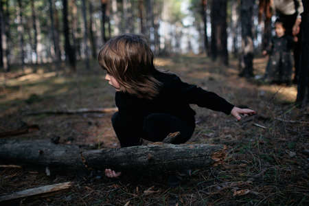 Kid Boy in black clothes is trying to raise a log in the autumn forest background. Disobedience. Generation gap. Dark photo.
