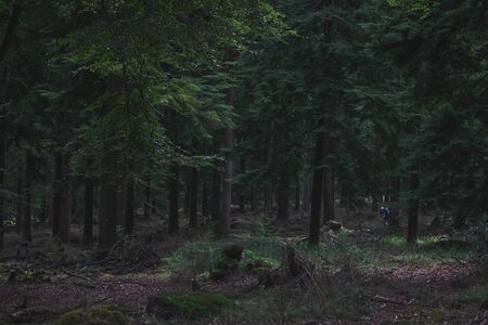 Man in a dark forest looking at a lighted road, view in autumn day, sharpness of the photo in the background