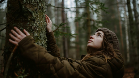 Portrait of attractive caucasian woman enjoying nature in a forest.