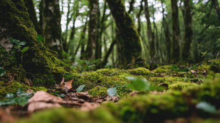 A serene view of a lush forest floor showcasing vibrant green moss surrounded by fallen leaves and majestic trees. The natural light filters through the foliage, creating a tranquil atmosphere ideal for nature lovers and outdoor enthusiasts.