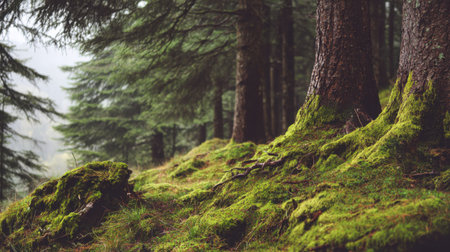 A serene forest scene showcasing a vibrant moss-covered floor, large trees, and the soft embrace of morning mist, perfect for nature lovers and peaceful retreats.