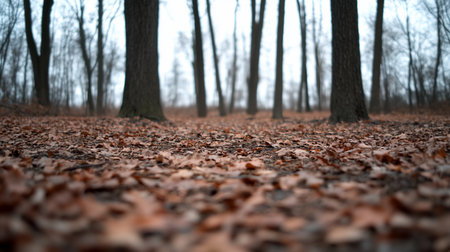 A dense carpet of dry, crinkled brown and orange autumn leaves covers the forest ground, displaying natural organic textures.