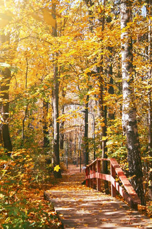 Wooden pathway in the morning autumn park. Beautiful landscape with yellow birches in october