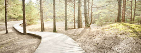 A wooden footpath through the old pine trees. Moss on the ground. Early spring in evergreen forest. Warm sunlight. Sun rays through the tree trunks. Latvia