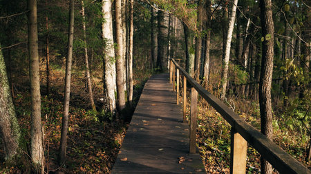 landscape. Wooden hiking path in a beautiful old forest in early spring. Wooden boardwalk in a forest preserve in early spring. low angle view of a wooden boardwalk.