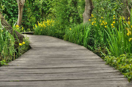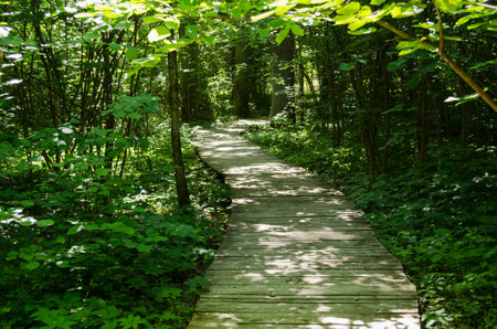 dark wooden footpath in swamp with beautiful evening sun light in green foliage of summer bog. wooden boardwalk in perspective view