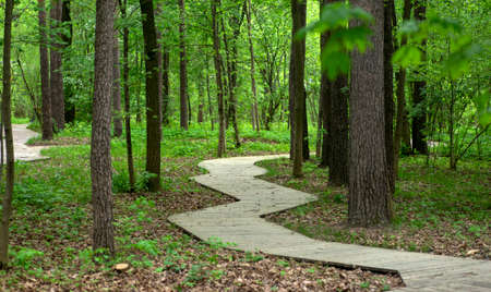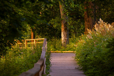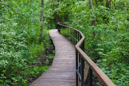 Wooden path in the forest or park in summer. Urban public park with wooden deck for walking and recreation