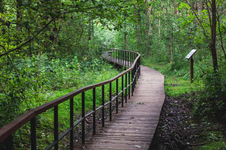 A beautiful wooden walking path in the park near a lake. A summer sunrise scenery in Latvia, Europe.