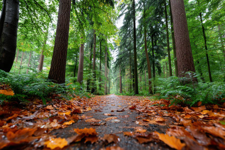A path winds through a lush autumn forest covered in wet fallen leaves