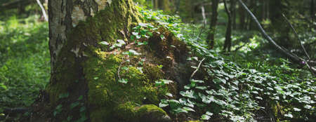 Natural scene of mossy tree stumps in the forest