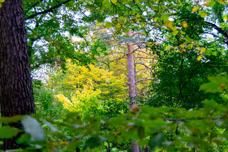An ancient forest on a bright sunny day. Bright colors of the surrounding nature. Unique natural colors