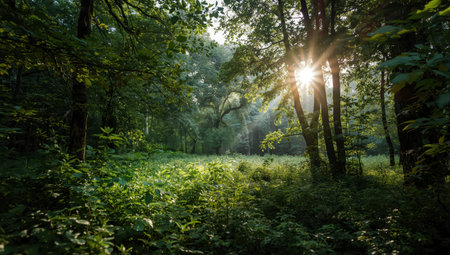 Lush green forest sunlight filtering through tall trees with serene morning glow