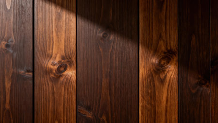 Close up view of vertical timber boards featuring deep chestnut stain and prominent circular knots, dramatically illuminated by a sharp beam of light creating high contrast shadows and highlighting...