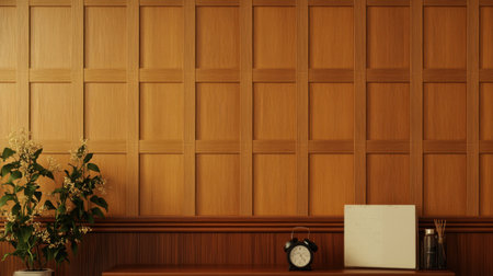 A serene wooden wall with a simple desk, clock, and plant creates a calming atmosphere perfect for modern interior design and creative workspace inspiration.