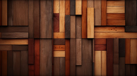 This is a close-up image of various wooden planks arranged in an eye-catching pattern, featuring rich colors and textures perfect for design projects or backgrounds.