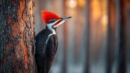 A striking woodpecker perched at dusk on a tree trunk, exploring its environment. The bird displays vibrant red feathers against the dark bark, showcasing nature's beauty.