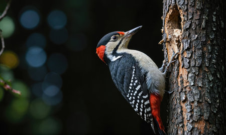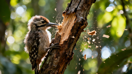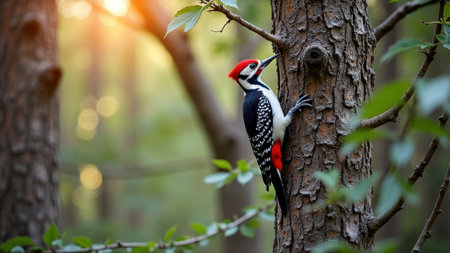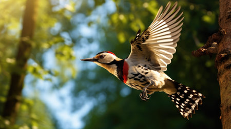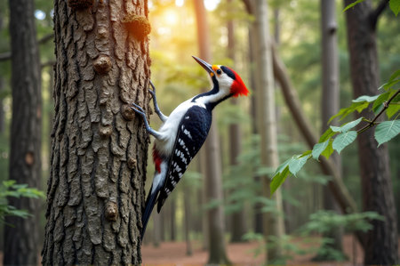 Great spotted woodpecker climbing tree in sunlit forest. That the image is generated using AI.
