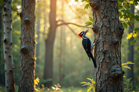 A woodpecker is perched on a forest trunk, showing its strong beak and vibrant colors in the morning light among the trees.