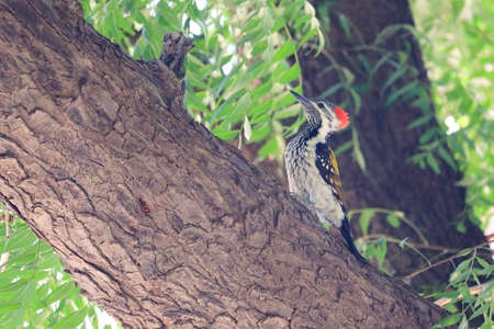 A striking woodpecker with a bright red crest and intricate black and yellow plumage rests on the rough bark of a tree. The birds sharp beak and intense gaze suggest alertness as it surveys its surroundings. Sunlight filters through the leaves casting a warm glow on the creature highlighting its unique markings