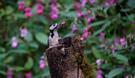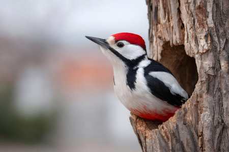 Great spotted woodpecker looks out from its tree hollow nest in natural habitat