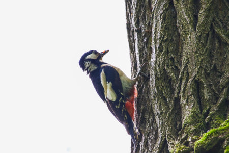 Great spotted woodpecker climbing tree trunk tapping bark searching for insects and larvae