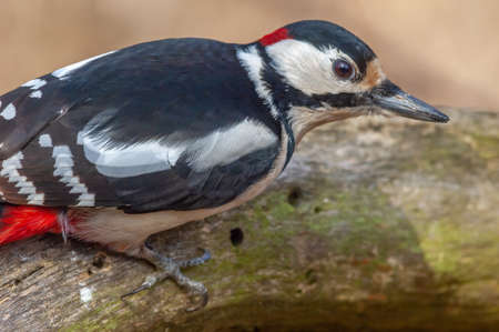 Woodpecker hammers fallen tree looking for food