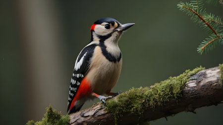 A stunning shot of a great spotted woodpecker perched on a lichen-covered branch in early morning light.