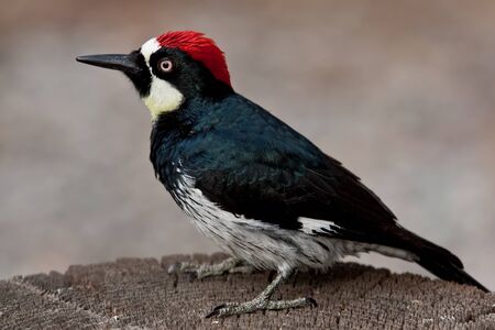 Adult male acorn woodpecker perched on dead tree stump.