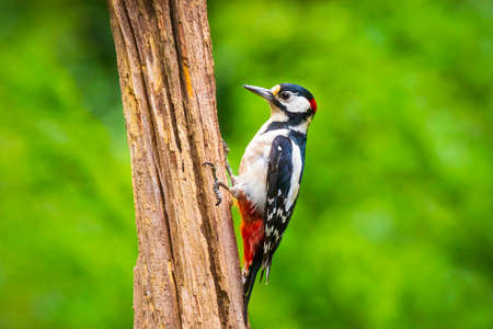 Closeup of a great spotted woodpecker bird, Dendrocopos major, perched in a forest in Summer season