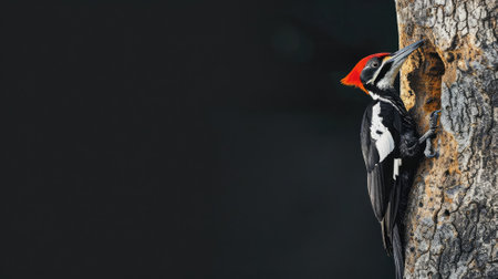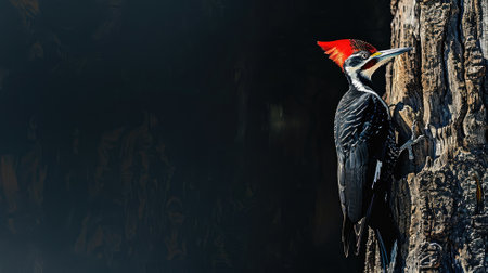 Pileated woodpecker on tree trunk with dark background
