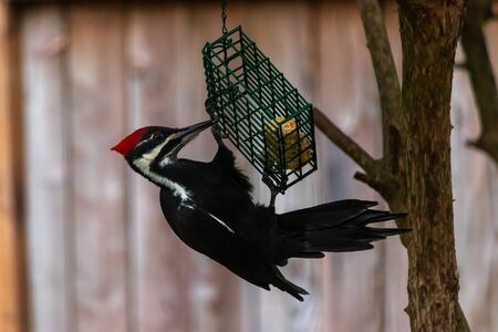 Pileated Male Woodpecker perched on tree trunk pecking for food in Quebec, Canada. North America bird