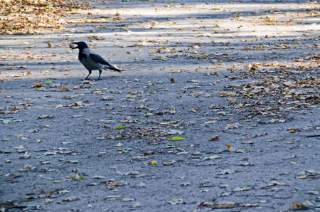 View with a crow bird walking on a meadow with a walnut in its beak during autumn, Sofia, Bulgaria