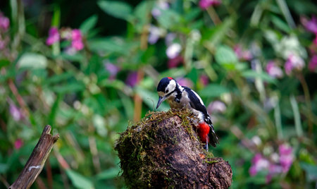 Great spotted woodpecker (Dendrocopos major) on a stump